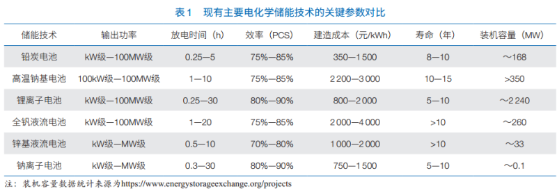 在能源革命的黃金時代,各類電化學(xué)儲能技術(shù)需針對其細分市場進行差異化發(fā)展。然而無論對于哪一種儲能技術(shù),其必須滿足?3?個基本要求:安全性高,全生命周期的性價比高,以及全生命周期的環(huán)境負荷低。目前,技術(shù)成熟度較高的鋰離子電池、全釩液流電池和鉛炭電池等電化學(xué)儲能技術(shù)都基本實現(xiàn)市場運營,在不斷發(fā)展的能源格局中迭代發(fā)展,其基本技術(shù)參數(shù)列于表?1。在未來?20?年內(nèi),這些技術(shù)有望占領(lǐng)絕大部分電化學(xué)儲能市場。